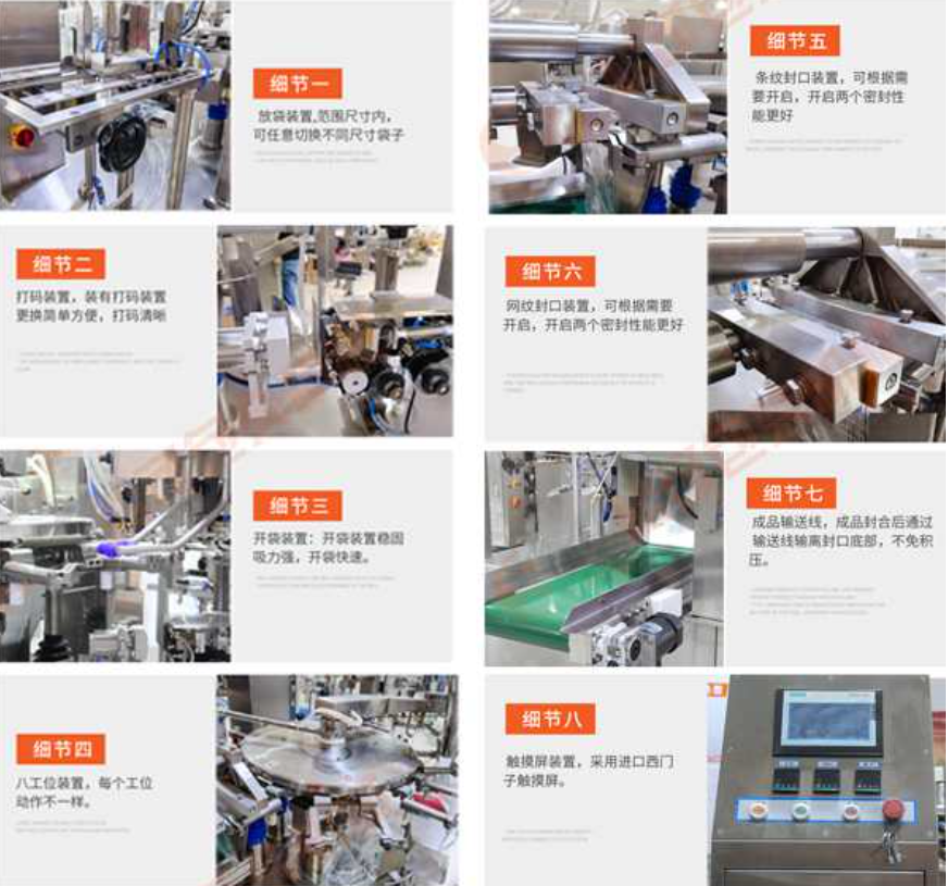 給袋式自動包裝機使用的是預(yù)制自立袋(已經(jīng)制作好的袋子),自立袋,四邊封袋、拉鏈自立袋、八邊封拉鏈袋。